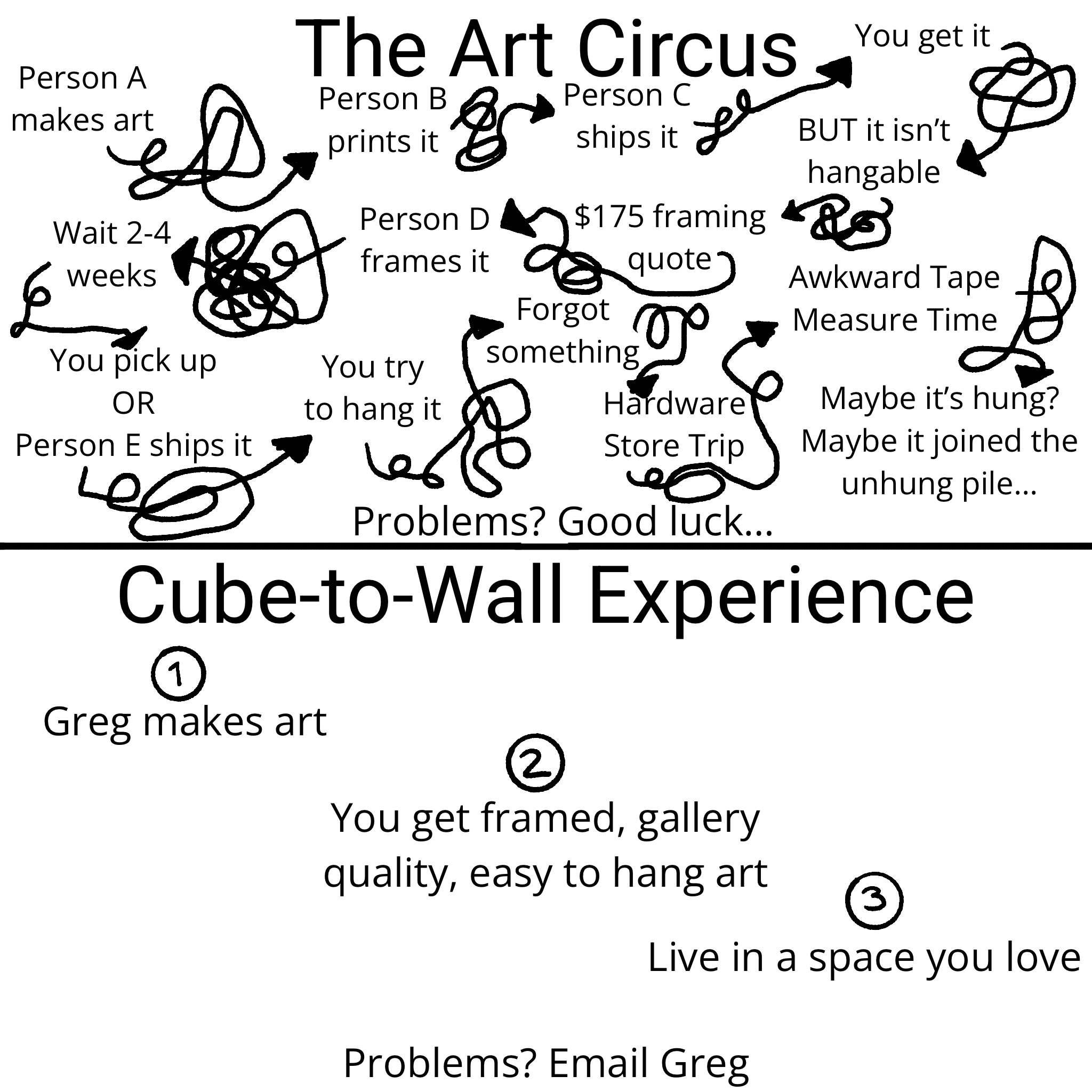 Greg's "Cube-to-Wall" Process tames the "Art-Buying" Circus. No sketchy commissions, galleries, or AI. Just fine art prints direct from the artist.